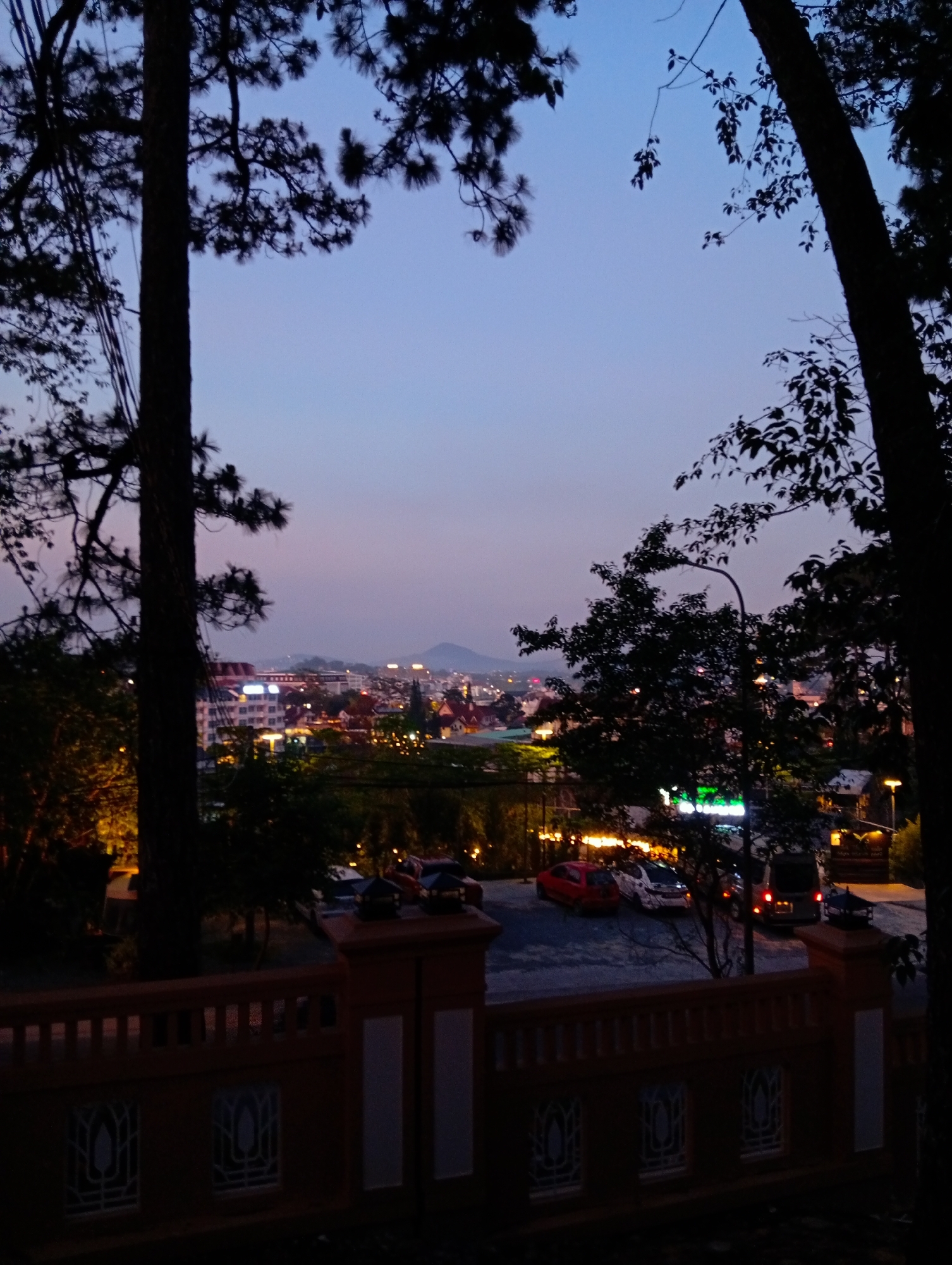 The image depicts a cityscape at twilight, likely taken from an elevated position overlooking a city. In the foreground, there is a decorative reddish-brown wall with white rectangular insets. The wall's design features repeating patterns along its length, with vertical slats. Two silhouetted trees frame the view, one on each side, with their branches extending into the sky. Beyond the wall, there's a parking area with several parked vehicles, including cars and a van. Lights illuminate the parking area and surrounding structures, creating a mix of shadows and highlights. In the middle ground, a city sprawls out, with buildings illuminated by interior lights. The skyline is visible in the distance, and the sky transitions from a deep blue to a lighter gradient with hints of pink and purple near the horizon, indicating twilight or dusk. The specific location is likely in Da Lat, Vietnam due to the presence of distinctive building styles and the environmental features consistent with that region. No people are immediately apparent in the scene.