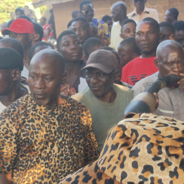 A dense crowd of 20-30 individuals, primarily adult males, is gathered outdoors in Akwanga, Nigeria