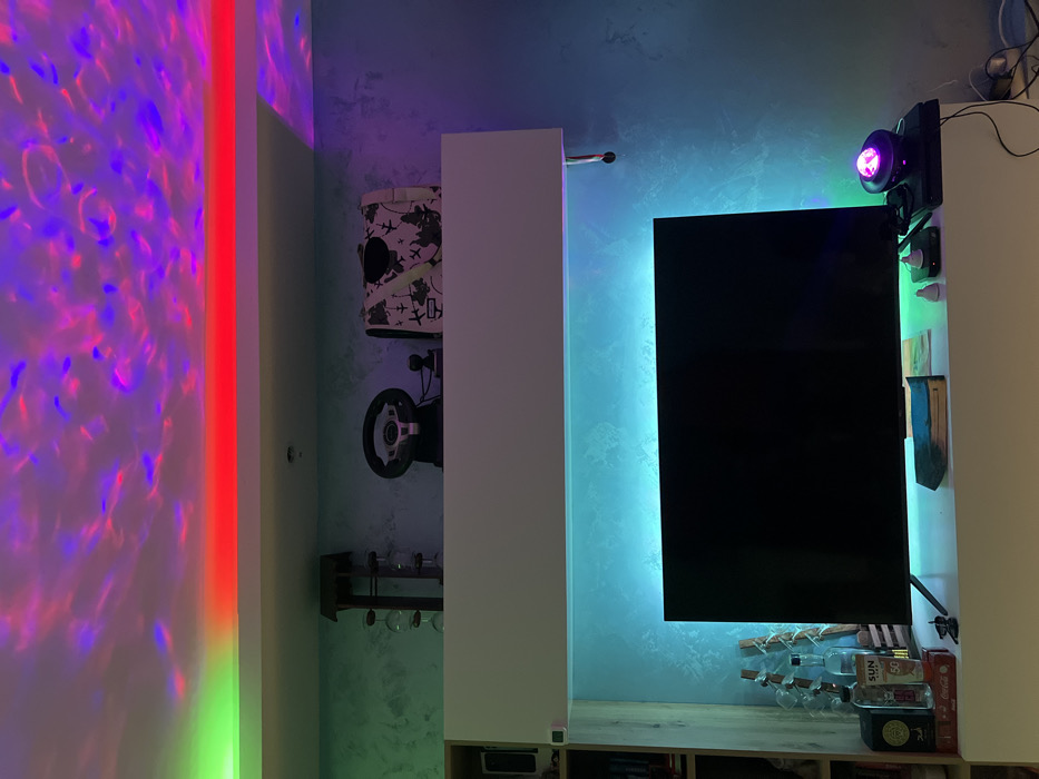 This image depicts an artificially lit interior room in Karnobat, Bulgaria, likely a living or entertainment area. The ceiling exhibits dynamic, swirling patterns of pink, purple, and blue light projected onto its white surface. Below this, a horizontal LED strip casts red light centrally, transitioning to green on the left. The room features textured, blue-grey walls. A white, wall-mounted shelf is positioned in the upper-middle section. On this shelf, from left to right, are a dark wooden rack holding several empty wine glasses, a black gaming steering wheel and an associated joystick, and a light-colored bag patterned with dark aircraft motifs. Below this shelf is a larger, white entertainment unit. A large, black, flat-screen television is centrally mounted on this unit, its screen dark. Behind the television, a teal-blue LED strip illuminates the wall, creating a glowing accent. On the entertainment unit's surface, to the left of the TV, are a small wooden crate, two clear glass bottles (one labeled "SUN 50"), several smaller bottles, and a Coca-Cola can. To the right of the TV, a small, dark, dome-shaped device projects purple light, presumably a star or nebula projector. Nearby are two small white objects and a dark, flat rectangular item. Various power cables and wires are visible on the right side of the unit. A portion of a wooden bookcase is visible on the far left edge of the image. No individuals or animals are present in the scene.