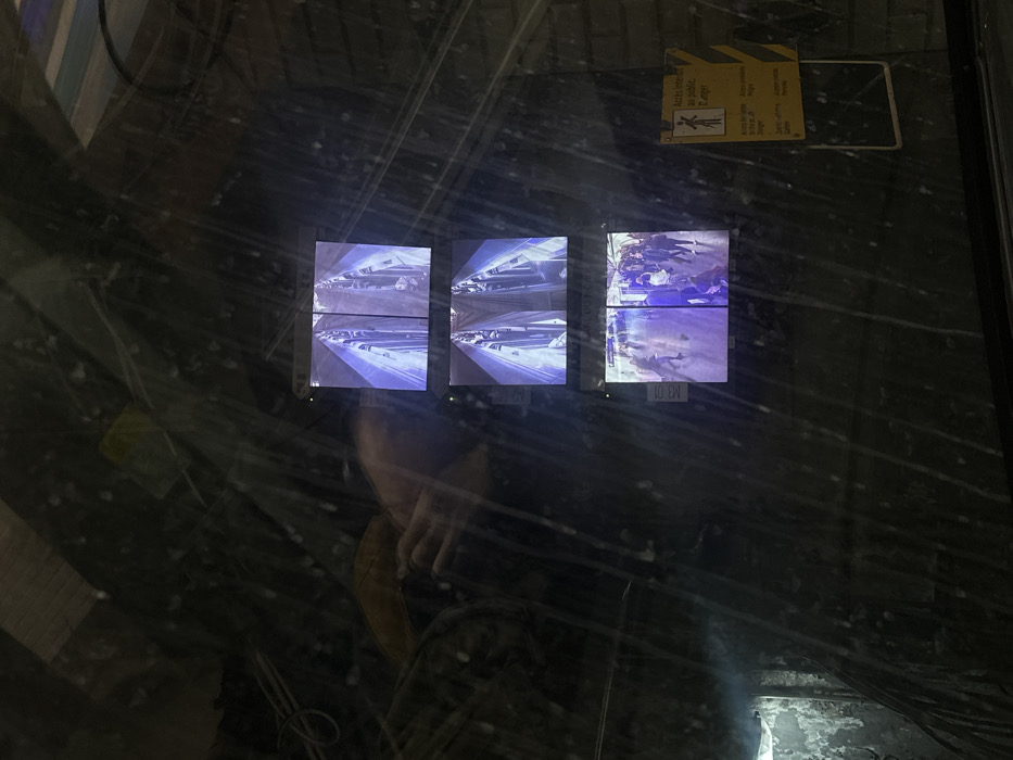 The image depicts a view captured through a reflective glass barrier, exhibiting surface streaking and reflections. Three rectangular monitors are vertically arranged, displaying security camera feeds. The top two monitors present identical or highly similar perspectives of a subway tunnel interior, showing parallel tracks, structural elements, and receding tunnel walls illuminated with a distinct blue-purple light. The bottom monitor displays a split-screen view of a subway platform or concourse, populated by multiple individuals walking, standing, and congregating under similar blue-purple lighting. Reflected in the glass on the left side of the image are parts of a person's hands, seemingly holding a device used to take the photograph, along with indistinct shapes suggesting the interior from which the photo was taken. To the right of the monitors, a yellow sign with black diagonal stripes is visible, bearing the French text "Accès interdit au public. Danger." and "Accès réservé au personnel de la RATP." The scene is an RATP (Régie Autonome des Transports Parisiens) operational facility, likely a control room or staff area, within the city of Saint-Ouen-sur-Seine, France, monitoring underground transit operations.