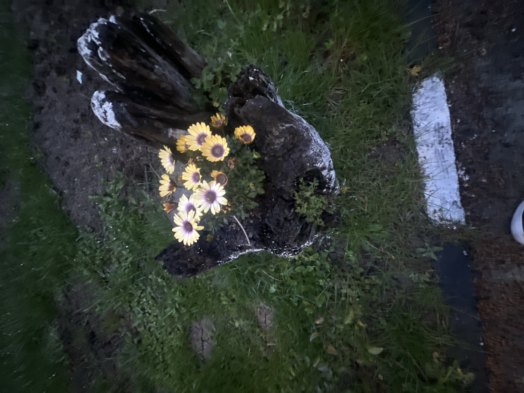 A high-angle outdoor photograph taken in dim lighting features a hollowed-out, dark-colored tree stump serving as a planter