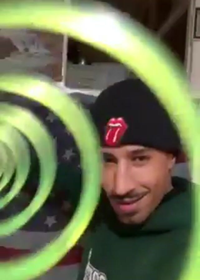 A person is recording themself with an American flag in the background. The person wears a green hoodie with a "Boston Celtics" logo. The person wears a black beanie with a red logo. A green, swirling, circular object is in front of the camera, obscuring the subject's face for part of the recording. The camera falls, and the recording ends.