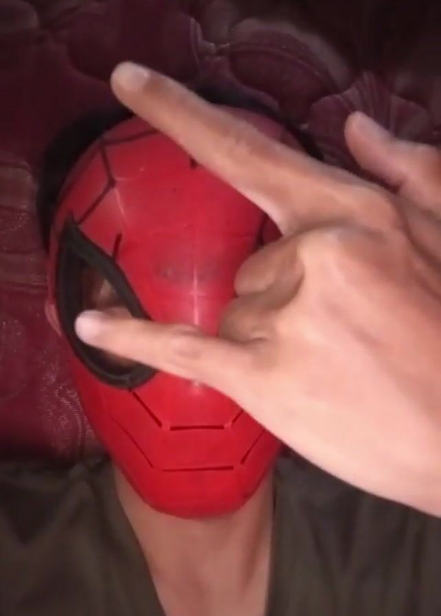 person wearing a red plastic Spider-Man mask, lying down on a burgundy colored mattress