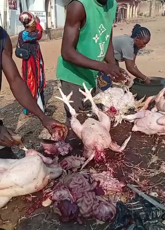 group of people processing chickens outdoors. A man in a green tank top stands at a wooden table, butchering the birds. Several dead chickens lie on the table, along with piles of entrails and other discarded parts. Two other people are visible in the background. One, wearing a colorful dress, is observing, while the other is washing something in a bucket. The table is covered with blood and feathers. The environment seems to be a public area near a building, possibly a market or a roadside.