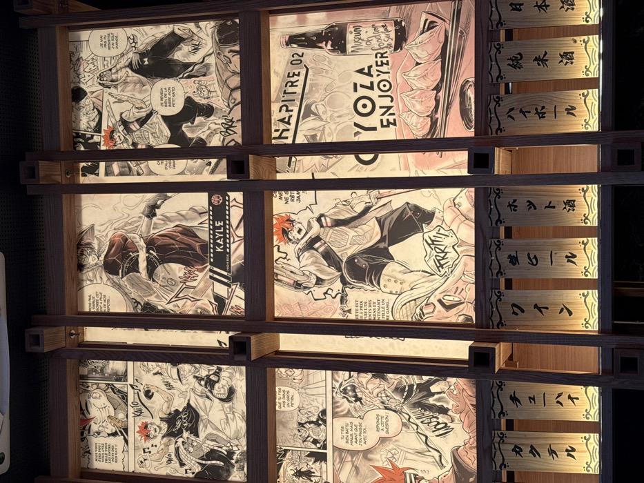 This image depicts a section of an illuminated interior wall inside the Oyoza Japanese restaurant, located at 15 Rue Notre Dame, Luxembourg City, Luxembourg