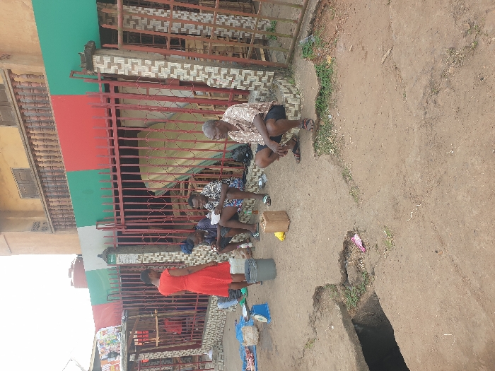 The image depicts an outdoor urban scene in Umuahia, Nigeria. Four individuals are present: one woman and three men. A woman in a red dress stands with her back partially to the camera, facing left towards a makeshift stall structure on the far left. Two men are seated on a low, tiled ledge behind a red metal fence. The man on the left wears a dark shirt and shorts, holding a white bowl. The man to his right wears a patterned shirt and shorts, looking down at an object in his hands. A third man, wearing a patterned short-sleeved shirt and dark shorts, is squatting on the dirt ground to the right of the seated men. The immediate foreground features uneven dirt and cracked concrete ground, with a large, open drainage culvert visible on the left. Small patches of green vegetation and scattered debris are present on the ground. Near the woman's feet, a blue weighing scale, a grey bucket, a brown wooden box, and a yellow plastic bag are arranged on the ground. Behind the red metal fence, which features columns adorned with brown and beige patterned tiles, stands a multi-story building with a yellowish facade. A section of the building's exterior wall above the fence is painted with horizontal stripes of green, red, and green. An upper-story balcony with dark railings is visible. A red water tank is situated on the roofline or upper level of the building. Several large, rectangular objects, resembling mattresses or wooden panels, are propped vertically against the building behind the fence. The scene is illuminated by daylight.