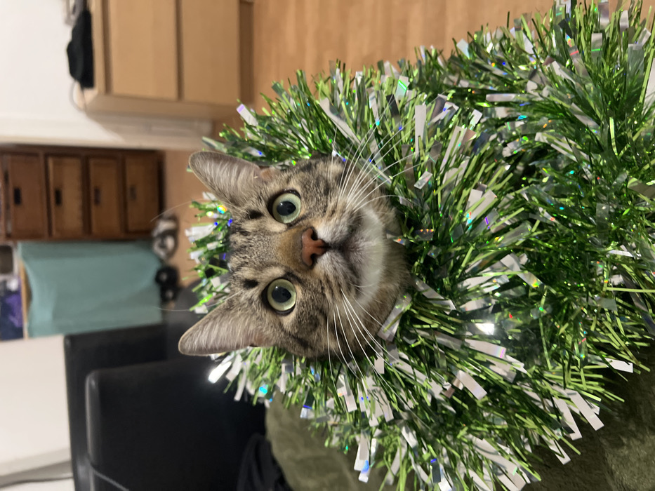 - "A tabby cat peeks through a wreath of green and silver tinsel" by FM-uZazy2, licensed under CC BY 4.0