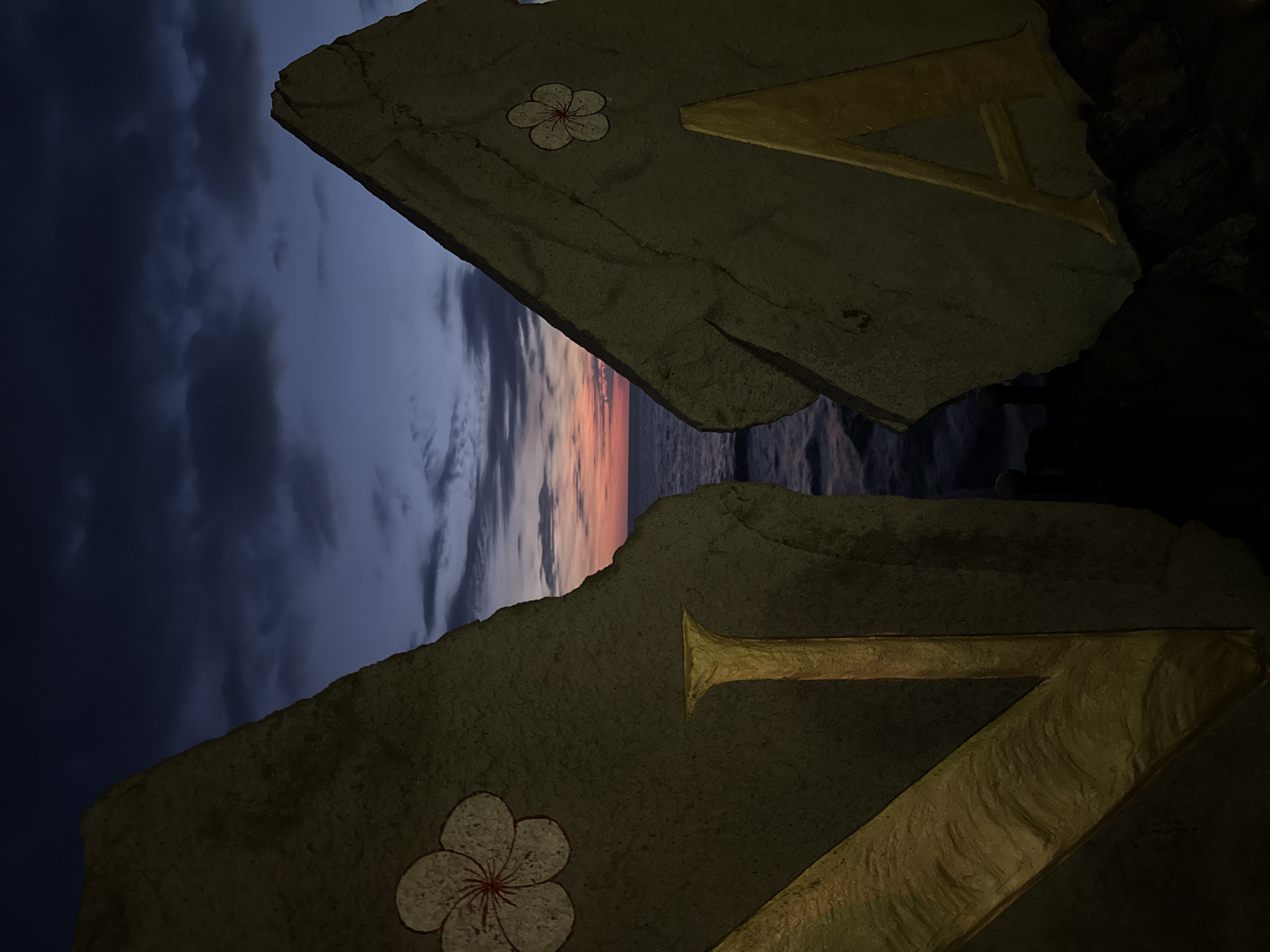 The image presents a close-up view of two stone structures adorned with golden symbols, set against a backdrop of a twilight sky and the ocean in Pererenan, Indonesia. The stone structures feature a textured surface, with a flower motif and a golden "V" symbol on each. The upper stone is positioned at an angle, while the lower one is similarly oriented but contains the base part of the "V" in golden color. The background reveals a dramatic sky transitioning from deep blue, indicating the transition between day and night. The ocean is visible in the narrow space between the stone structures, adding to the overall serene yet evocative mood of the photograph.