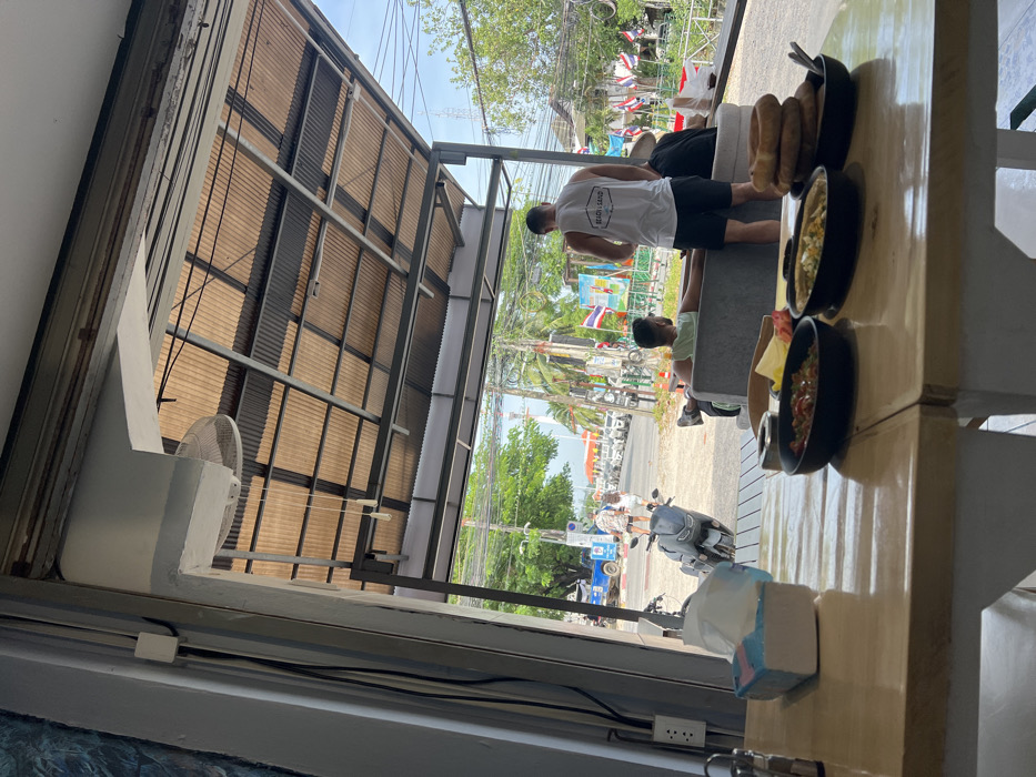 An open-air restaurant scene shows patrons seated at a table. One wears a white tank top and black shorts, facing the street. The table holds bread and several bowls of food. Outside, a street scene includes palm trees, utility poles, and parked scooters. Thai flags hang on poles along the street. The restaurant has a corrugated metal roof and an oscillating fan on the wall. A tissue box sits on the table.