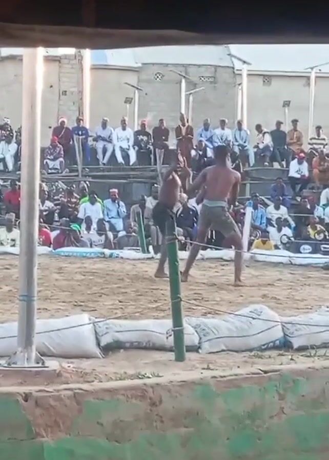 Two shirtless men are wrestling in a sand pit. There is a crowd of spectators watching them. The wrestling pit is enclosed by a low wall and sandbags. There is a green pole in the middle of the ring. Some people are sitting on bleachers in the background.
