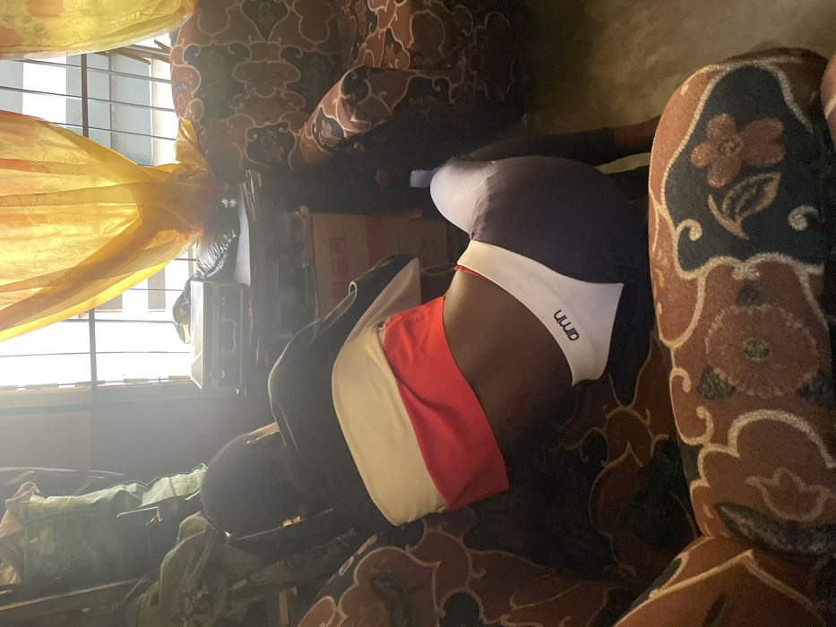 An individual with dark skin, whose gender appears female, is depicted lying or leaning on a patterned couch in an indoor setting in Nkpor, Nigeria. The person is seen from the back and side, facing towards a brightly lit window. They are wearing a three-banded top, red, white, and black, which exposes the midriff. Below the top, white athletic-style underwear or shorts with "aimn" visible on the waistband are worn over dark-colored leggings or pants. The individual's back is slightly arched. The couch they are resting on features a repeating floral or abstract pattern in shades of brown, red, and black. A second, similarly patterned couch is partially visible to the right. In the background, a window with vertical security bars is present, letting in significant light and partially covered by sheer, yellow-orange curtains. Below the window, a silver metallic case, a dark plastic bag, and other indistinct items are placed on a surface. The left side of the background shows an accumulation of items, including what appears to be green bags or textiles. The flooring is dark.