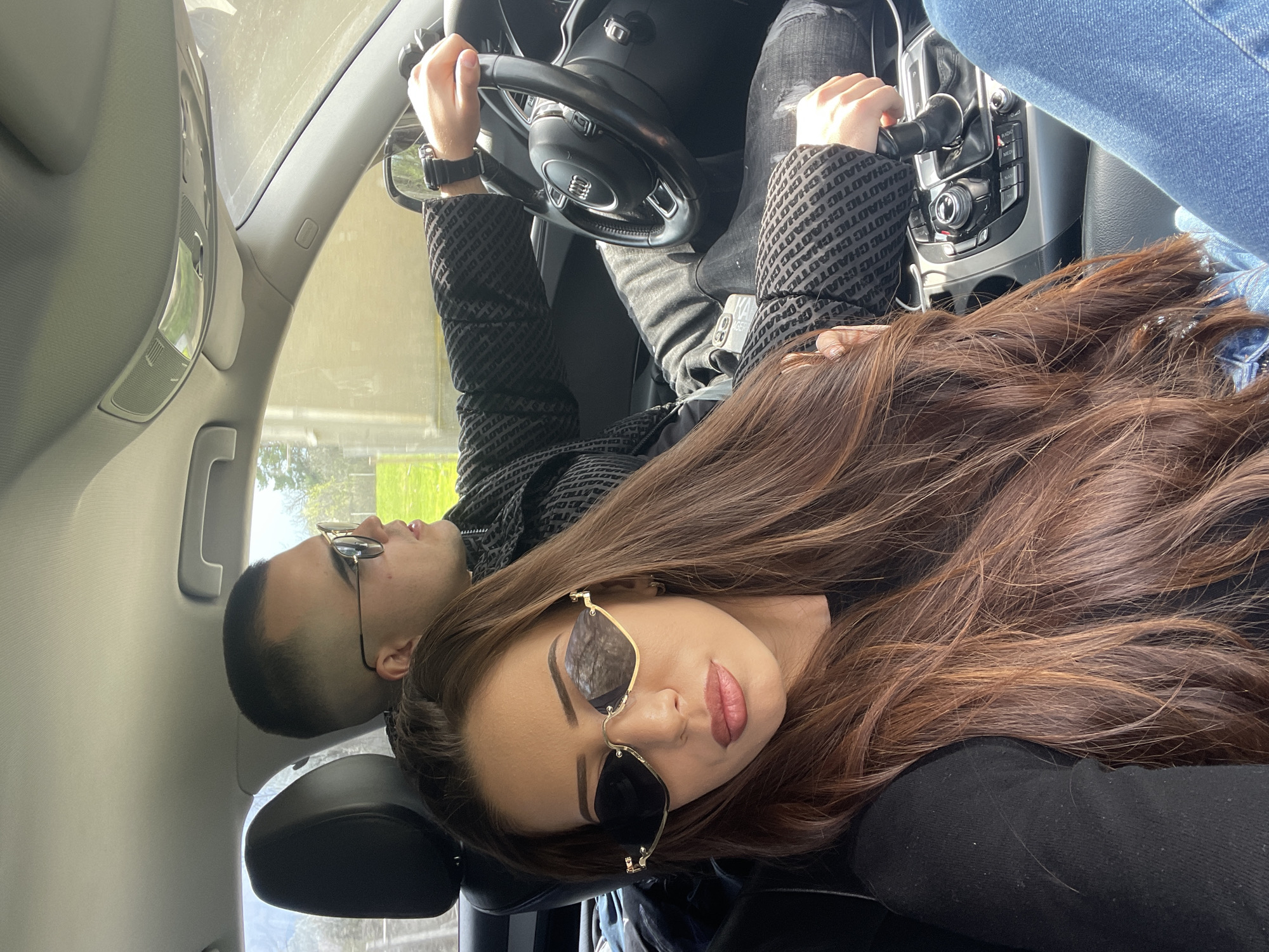 Two people are in a car. A woman with long brown hair is reclined in the passenger seat, facing the camera and wearing sunglasses. A man with short, cropped hair is behind the wheel of the car, holding the steering wheel. He is also wearing sunglasses. The interior of the car is visible. It is an Audi, with a steering wheel that features the signature four rings logo. The man is wearing a black jacket with repeating text in white, and jeans. The background includes a view through the car's windows of green vegetation. The location appears to be Pchelishte, Bulgaria, based on the license plate number on the car.