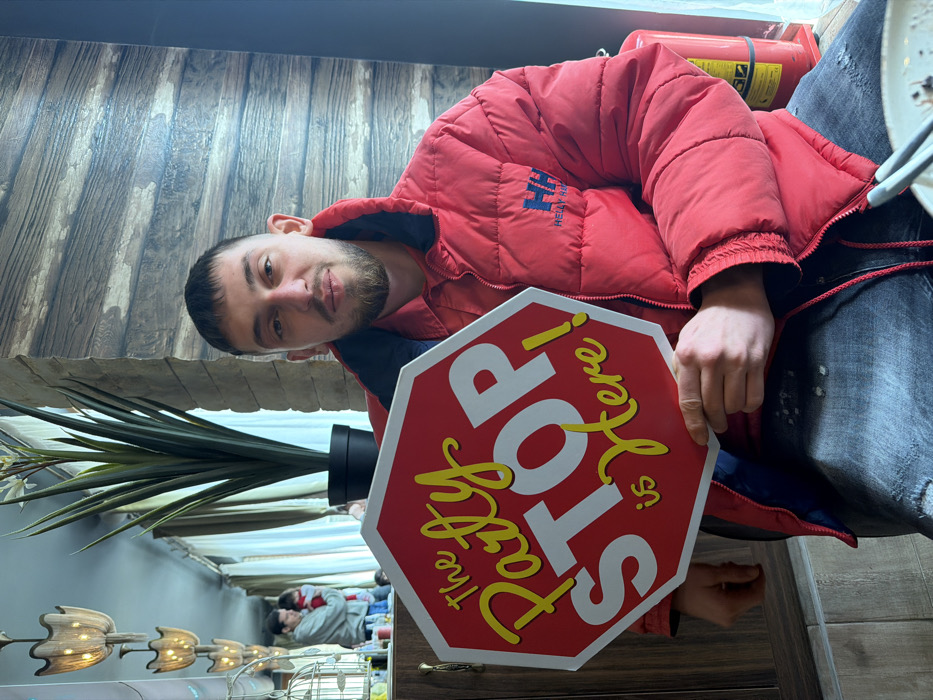 An indoor scene in Lyuben Karavelovo, Bulgaria, features a male subject in the foreground, seated and holding an octagonal red sign