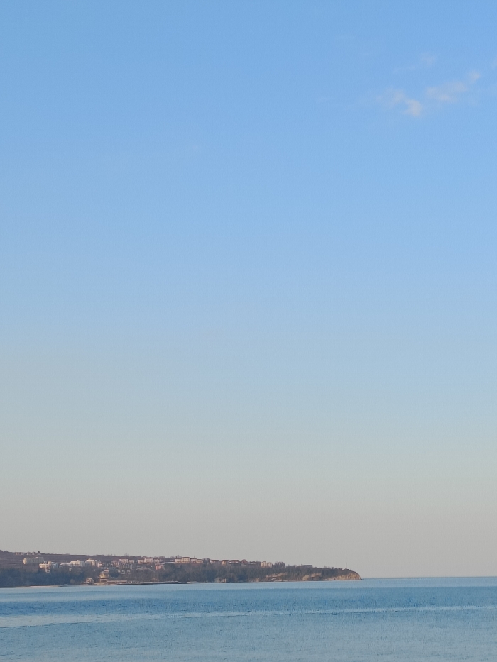 The image presents a panoramic coastal view of the city of Obzor, Bulgaria. The upper two-thirds of the frame are dominated by a clear, light blue sky, with a single faint white cloud appearing in the upper right quadrant. A distinct horizon line separates the sky from the landmass and sea. In the middle ground, a long stretch of land, identified as the coast of Obzor, extends horizontally, featuring gentle elevation. This land is partially covered by sparse, deciduous-appearing vegetation. Numerous light-colored buildings, consistent with residential or resort architecture, are distributed along the elevated coastal strip. The lower third of the image comprises the calm, light blue-green waters of the Black Sea, exhibiting minimal surface disturbance. On the far right side, at the apex of the headland, a small, white, cylindrical lighthouse structure is visible. There are no individuals, animals, or active vehicles present in the depicted scene.