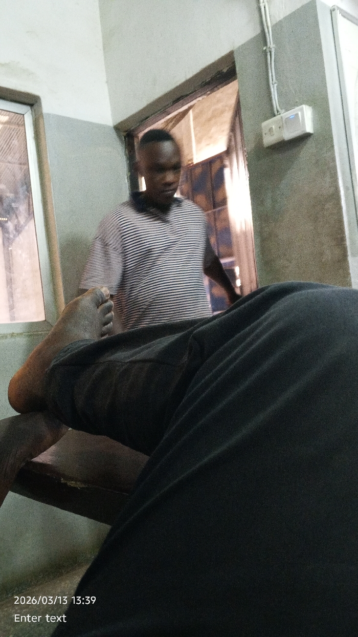 The image captures an interior scene, likely within a public or institutional building in Dakata, Nigeria. In the immediate foreground, the right leg and bare foot of an individual, dressed in dark trousers, are visible, with the foot resting horizontally on a worn, dark wooden or metal surface. In the midground, a male individual, slightly blurred, stands in a doorway, facing generally forward. He is wearing a short-sleeved, horizontally striped polo shirt (white and dark stripes). The background reveals light-colored walls; a window with a metallic frame is visible on the left. On the right, a white electrical conduit runs vertically on the wall, connecting to a wall-mounted white electrical box or switch. The doorway he stands in leads to a dimly lit area with possibly a patterned or barred surface visible through it. The timestamp "2026/03/13 13:39" is present in the lower-left corner.