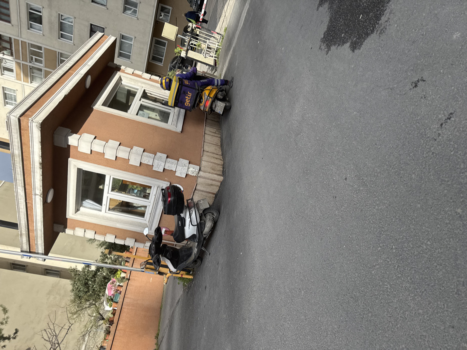 The scene depicts an outdoor urban environment within the city of Zeytinburnu, Turkey. In the foreground, dark asphalt pavement covers the lower portion of the image. A small, single-story, light brown building, resembling a security booth, occupies the mid-ground. This building features white-framed multi-pane windows and decorative white block-style trim on its corners and along the roofline. To the left of the building, a light-colored scooter, identifiable as a Kymco and equipped with a black rear storage box, is parked on its kickstand next to a yellow and black striped bollard. A partially visible red traffic cone is situated behind the scooter. To the right of the building, a yellow scooter is positioned. An individual is mounted on this scooter, dressed in a purple uniform, wearing a yellow helmet, and carrying a large yellow delivery box branded with the word "getir" on their back. The individual is facing away from the camera. In the background, multiple light-colored, multi-story residential or apartment buildings with numerous windows are visible. Further to the right in the background, a white boom gate and a dark vehicle indicate a controlled access point. On the far left, behind a low wall, potted plants and some vegetation are visible. The scene is illuminated by daylight.