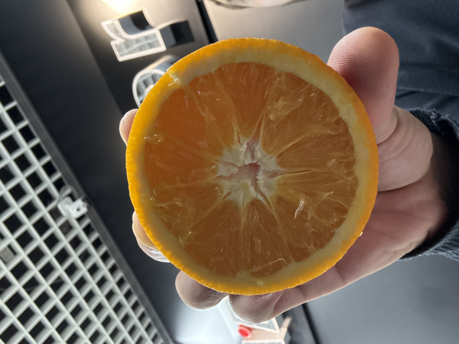 - "A close-up, low-angle photograph captured in Tashkent, Uzbekistan, shows a human left hand holding a horizontally bisected orange, presenting its cut surface directly towards the viewer" by FM-7p9nD3, licensed under CC BY 4.0