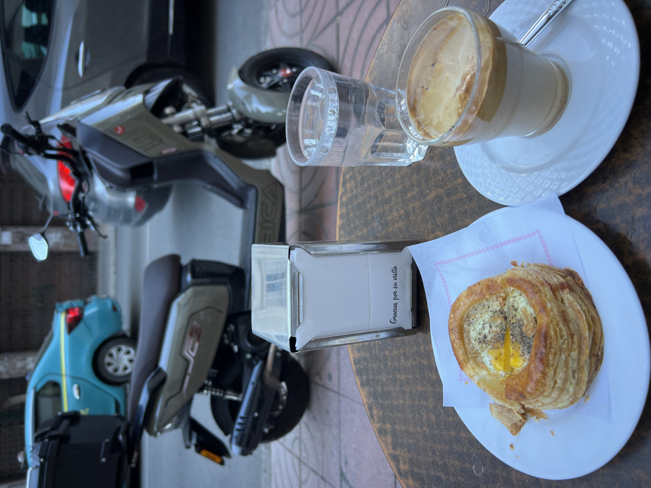 An outdoor cafe table in Tangier, Morocco, features a breakfast or snack setting. In the foreground, a round, dark brown table holds several items: a white plate with a golden-brown puff pastry containing a cooked egg, sprinkled with seasoning, resting on a white napkin with pink trim. To its right, a metallic and clear plastic napkin dispenser holds white napkins, one bearing the Spanish text "Gracias por su visita." Further right, a clear glass contains water, and another clear glass cup holds a layered coffee beverage on a small white textured saucer with a spoon. The midground, out of focus, reveals a light khaki-colored scooter with a brown seat, parked on a paved surface. Markings "JC3" and "BICA" are visible on its side. In the blurred background, a light blue sedan, consistent with a taxi, and a darker grey vehicle are parked on an urban street.