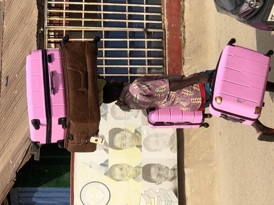 A male individual, dark-skinned, walks from right to left across a street scene in Accra, Ghana, under daylight conditions. He is seen in profile, wearing a patterned short-sleeved shirt (mauve with light gold leaf-like patterns), blue shorts, and red undergarment partially visible. He wears dark flip-flops. The individual is transporting four pieces of luggage simultaneously. Two suitcases are stacked and balanced on his head, supported by a yellow/green cloth headwrap: a bright pink hard-shell suitcase on top, and a brown soft-sided suitcase below it. The brown suitcase has a white tag dangling from one of its handles. A third bright pink hard-shell suitcase, identical in style to the one on his head, is carried on its side near his left shoulder. A fourth bright pink hard-shell suitcase, also identical, is being pulled by its handle on the ground to his right. The background on the left features a light-colored wall or billboard displaying a circular emblem, the partial word "EDUCATION," and faded black and white images of several smiling young boys, some associated with books, one with a "GHANA" badge. The lower portion of this wall is a rough concrete texture. To the right, a blue metal gate or fence with a grid pattern is visible. Above these structures, a weathered corrugated metal roof, rusted brown, is present. The ground is unpaved, appearing as dirt or rough concrete. A partial view of a dark-colored vehicle, possibly a car with a "GE" license plate fragment, is visible on the far right of the frame.