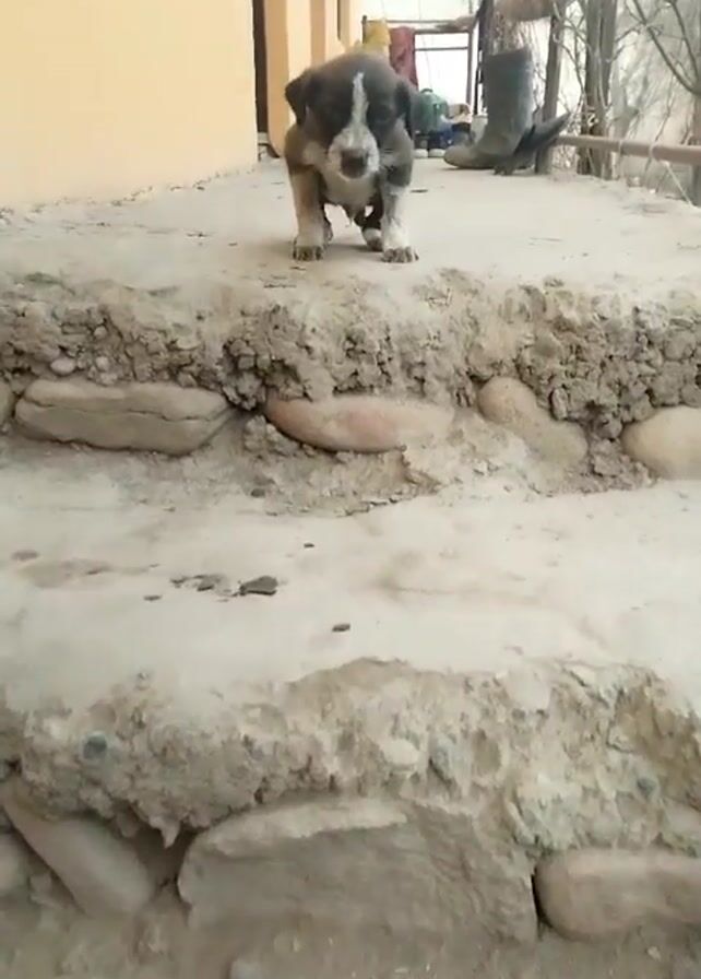 A close-up, full shot of a puppy on a concrete step. The puppy is brown and white, looking directly at the camera with a slightly quizzical expression. It stands on a concrete step, with a building visible in the background on the left and some miscellaneous objects like boots in the background on the right. The puppy makes a whimpering sound, then the video ends.