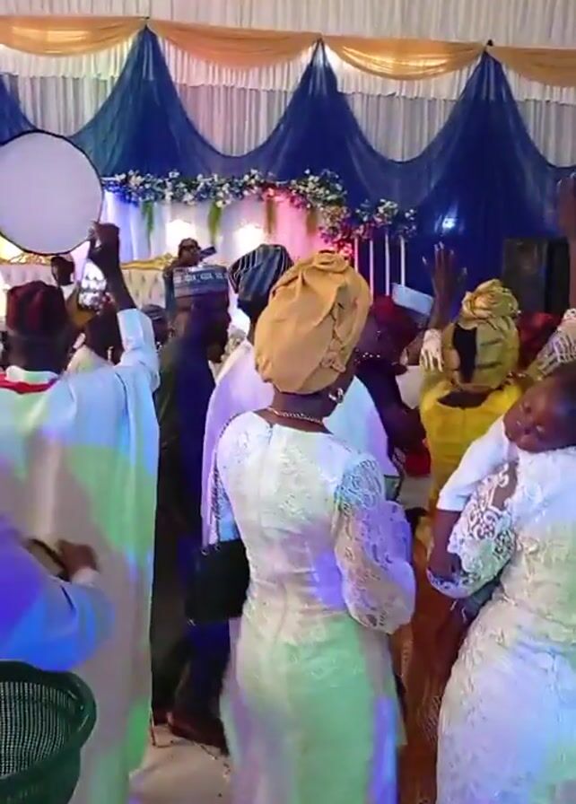 Inside a decorated event hall, a crowd of people, mostly in traditional Nigerian attire, are dancing and celebrating. A man in a white robe holds a white disc up in the air. The room is decorated with blue and gold drapes and blue and white floral arrangements on a stage in the background. People are moving around, celebrating, and dressed in various colorful outfits.
