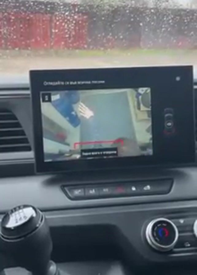 interior of a vehicle on a rainy day, focusing on the dashboard and a digital display screen