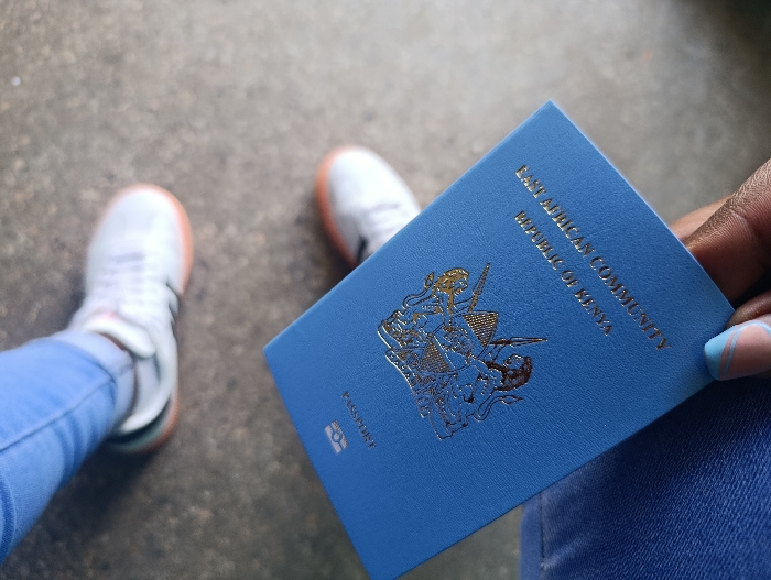 A person holds a blue Kenyan passport in their right hand, the cover displaying the words "EAST AFRICAN COMMUNITY REPUBLIC OF KENYA" in gold lettering above the country's coat of arms