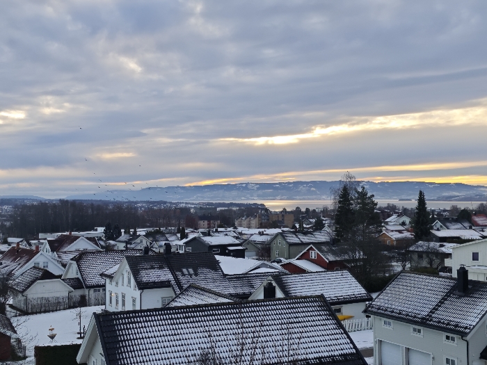 The image displays an elevated panoramic view of a snow-covered residential neighborhood in Hamar, Norway