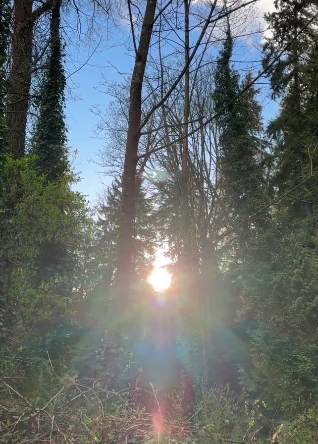 view looking up into a forest, with the sun shining brightly through the trees. The foreground is filled with fallen branches and greenery. The trees vary in type, some are covered in ivy. The sky is visible through the trees, and is blue with some scattered clouds. The sun's rays create a strong light flare and lens artifacts in the image.