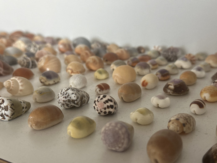 - "A close-up photograph displays hundreds of small seashells, approximately 1 to 3 centimeters in size, densely scattered across a flat, uniformly lit, light-colored surface" by FM-ZRzWg1, licensed under CC BY 4.0