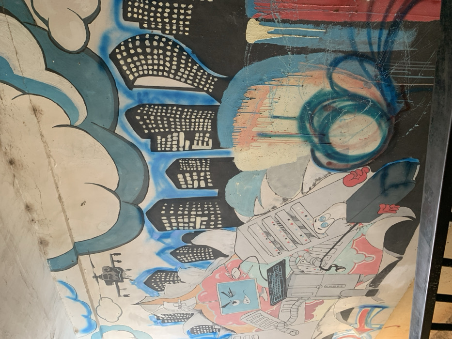 - "A mural is painted on a concrete wall, observed from a slight upward angle, with a black horizontal railing in the immediate foreground" by FM-4hiJG3, licensed under CC BY 4.0