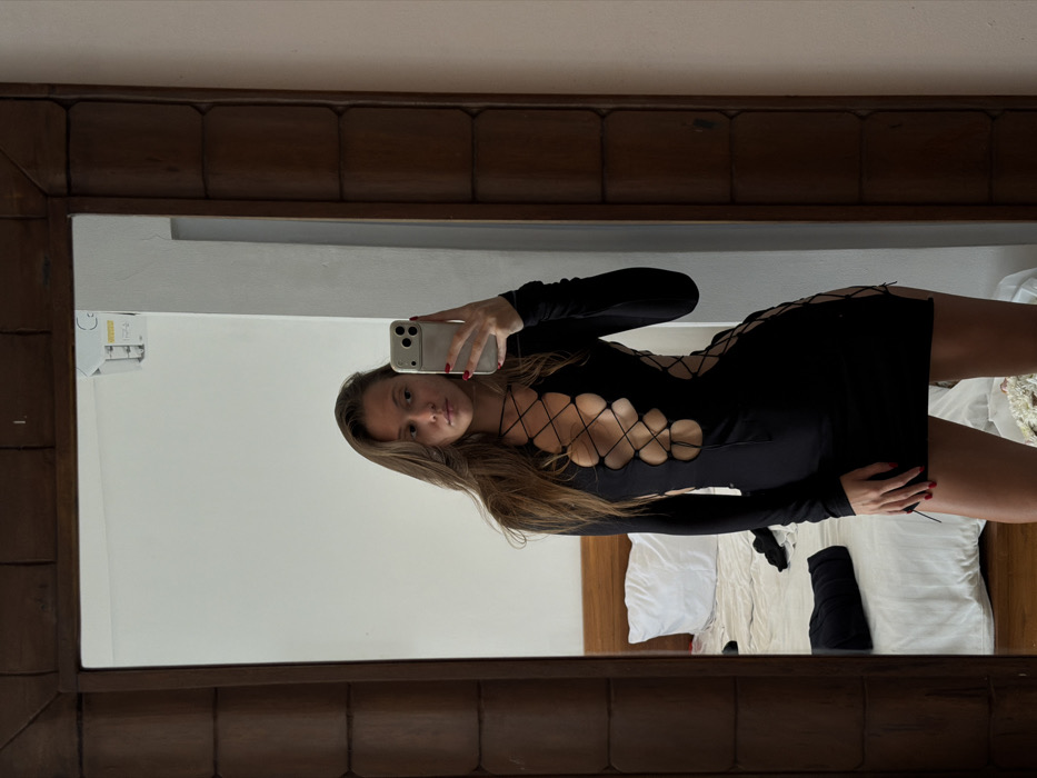 A female subject is captured in a mirror selfie within an indoor setting, identified as Tibubeneng, Indonesia. The subject, a young adult female with long, light brown hair, stands reflected in a large mirror framed by dark brown, segmented wood. She wears a black long-sleeved mini-dress featuring extensive lacing and cutouts along the front bodice and sides. Her fingernails are painted red. She holds a light-colored smartphone with three camera lenses in her left hand, positioned to capture the reflection. In the background of the reflection, a bedroom is visible, featuring a bed with a wooden headboard and white bedding, including a white pillow. A white wall is also visible, with a small, light-colored, wall-mounted electrical or climate control unit near the top right of the reflection.