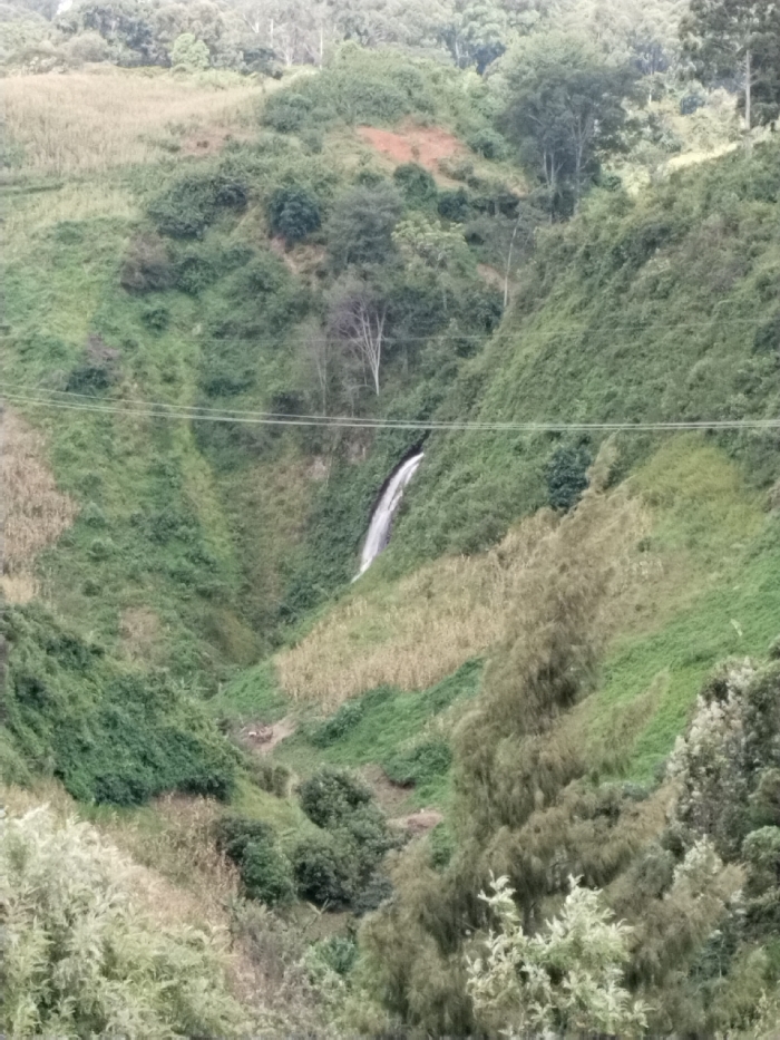 The image presents a deep, verdant valley located in Subukia ward, Kenya. A single waterfall descends down the central-left slope, appearing as a white cascade against the dark green rock face. The valley is densely vegetated with various shades of green foliage, including numerous trees and shrubs. Interspersed on the slopes are distinct, lighter brown patches of cultivated land, characteristic of dry crop stalks, likely maize. Two parallel utility lines, consistent with power or communication cables, traverse horizontally across the valley, passing above the upper section of the waterfall. Near the base of the valley, an indistinct area of disturbed ground or small, rudimentary structures suggests localized human activity or a pathway. No individuals or animals are present. The scene is illuminated by natural daylight.