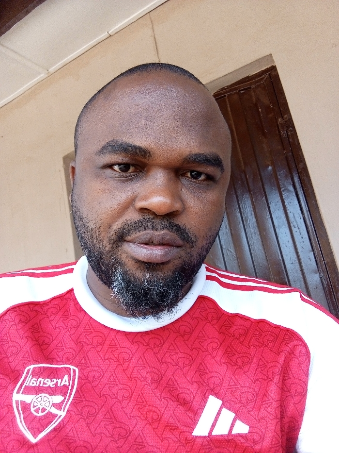 A dark-skinned adult male is depicted in a close-up, head-and-shoulders portrait, centered within the frame against a plain background in Sabon Tasha, Nigeria