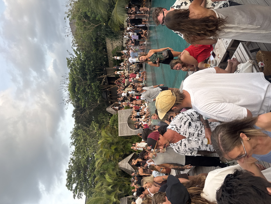 The image displays a crowded outdoor social gathering at a resort or club facility in Uluwatu, Indonesia, under an overcast sky