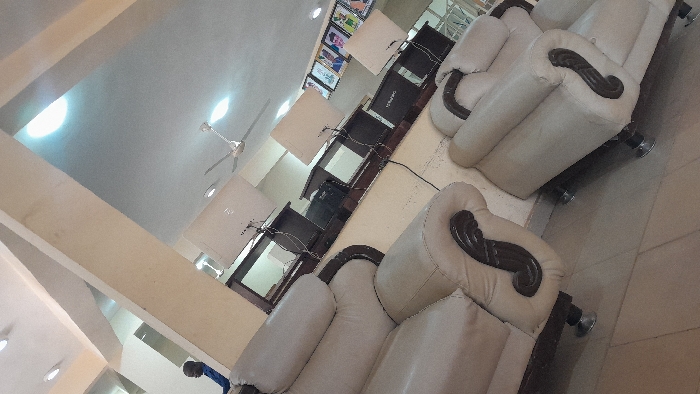 This image captures an interior scene within an establishment in Lafia, Nigeria, likely a waiting area, internet cafe, or office lounge