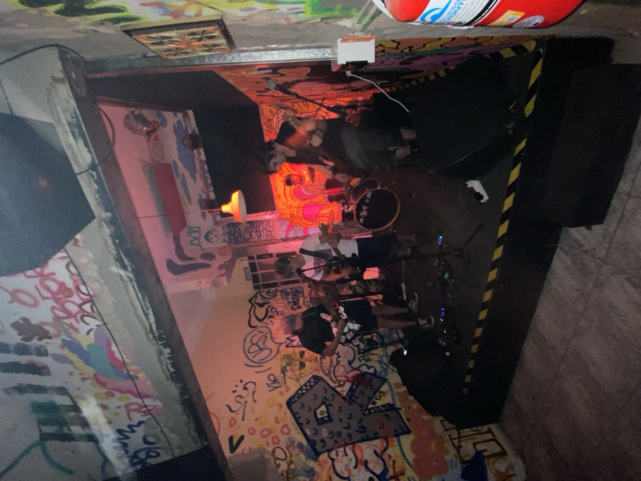 A band performs in a graffiti-covered room. Three musicians are visible, playing guitar and drums under a spotlight. The walls are densely decorated with various tags and colorful drawings. A fire extinguisher hangs near the ceiling, and black and yellow striped tape borders a section of the wall. Speakers stand against the walls, enhancing the music experience in the vibrant, unconventional space.