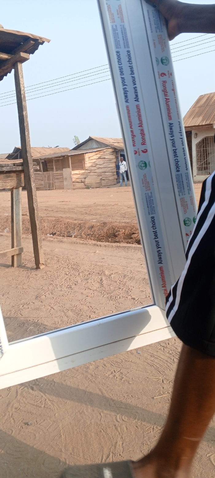 A white window frame is held up against a dusty, rural backdrop. The frame obscures part of the view, revealing buildings with corrugated metal roofs. The frame's side displays the text "Rongtai Aluminum Always your best choice" in red and green. A person's arm with a striped sleeve is partially visible on the right. The ground is sandy and uneven.