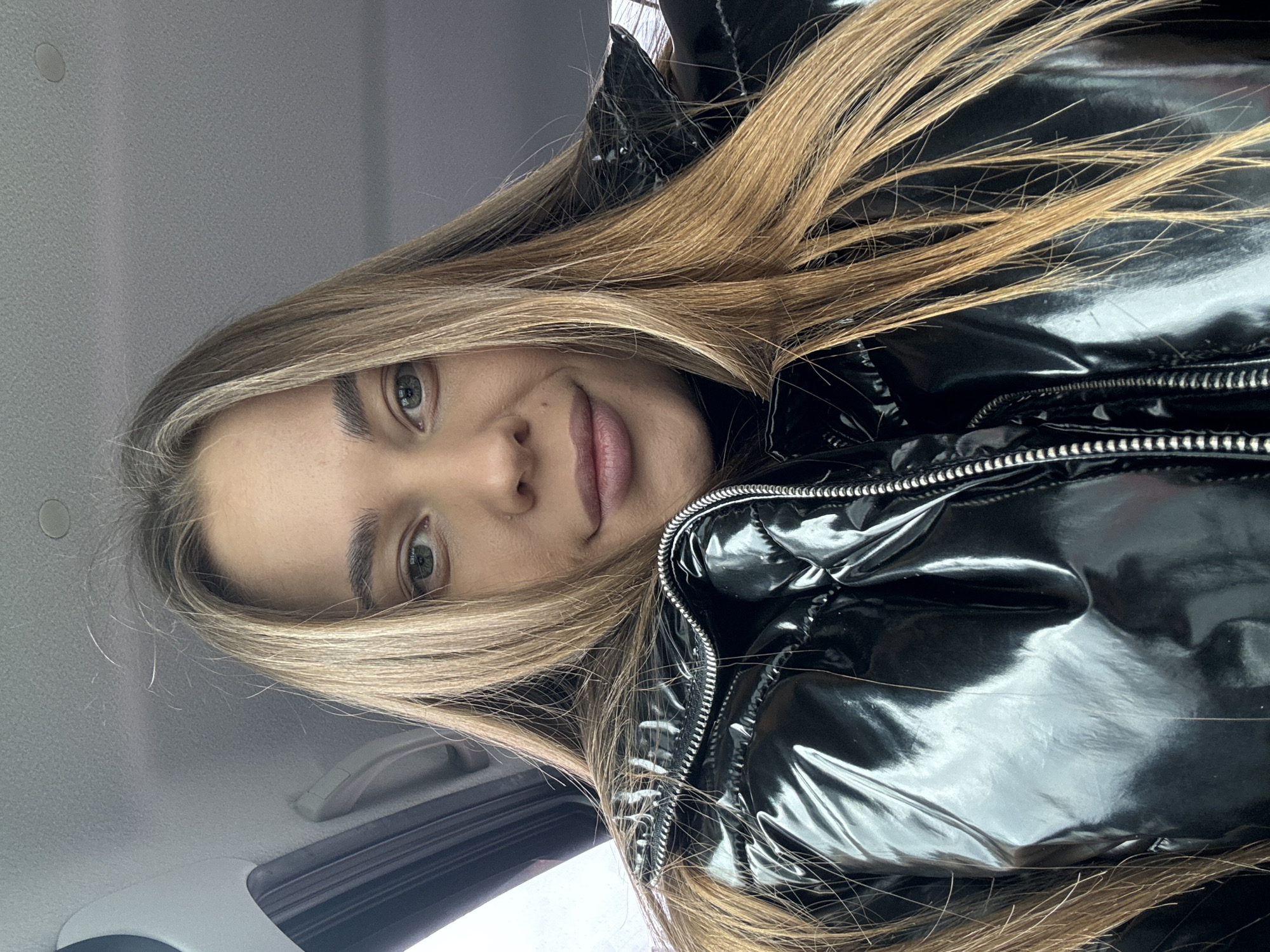 A young woman with long, blonde hair is centered in the frame, wearing a shiny black puffer jacket
