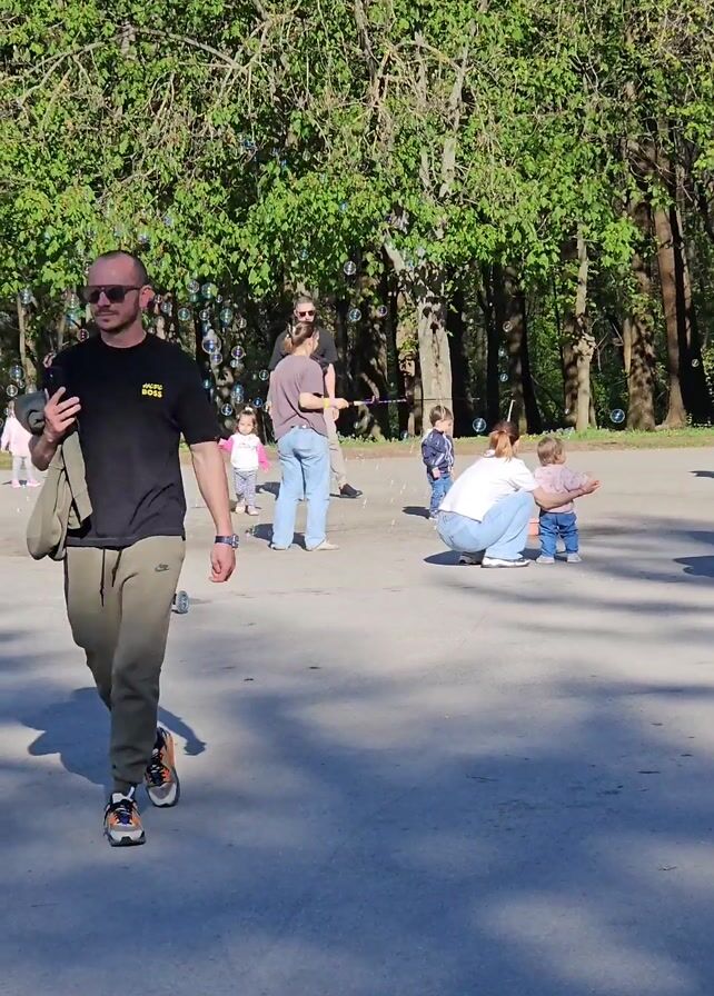 A sunny day in a park shows a group of people and young children enjoying activities. A man in sunglasses, a black t-shirt, and green pants walks towards the camera on a paved surface. He carries a jacket or bag over his shoulder and glances at his wrist. Several adults and young children are clustered in the background, some playing with bubbles. An adult creates bubbles with a wand. Two young children interact with a woman who is kneeling. A person on a bicycle passes through the group, enhancing the bubble display. The background is a mixture of trees and sunlight.