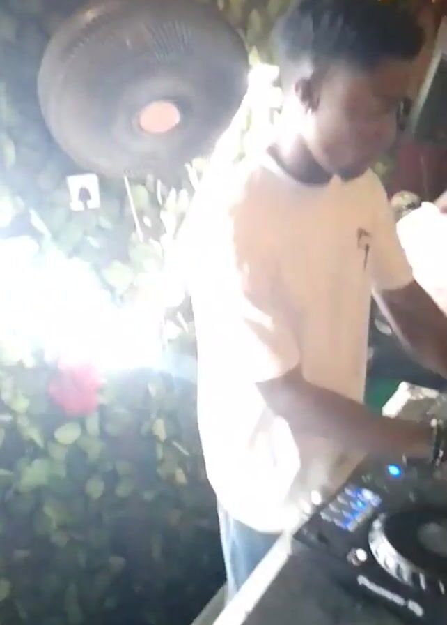 A young man is DJing at a party, focused on his equipment. He has short dark hair, is wearing a white t-shirt and jeans, and stands behind a black DJ console with Pioneer DJ equipment. A table with a keyboard sits in front of him. Behind him is a crowd of people socializing and dancing, some holding drinks. The venue appears to be outdoors or partially outdoors, decorated with plants and lights. A fan is visible on the left side of the frame. A man wearing a vest and hat walks across the frame. The overall atmosphere suggests a lively night out.