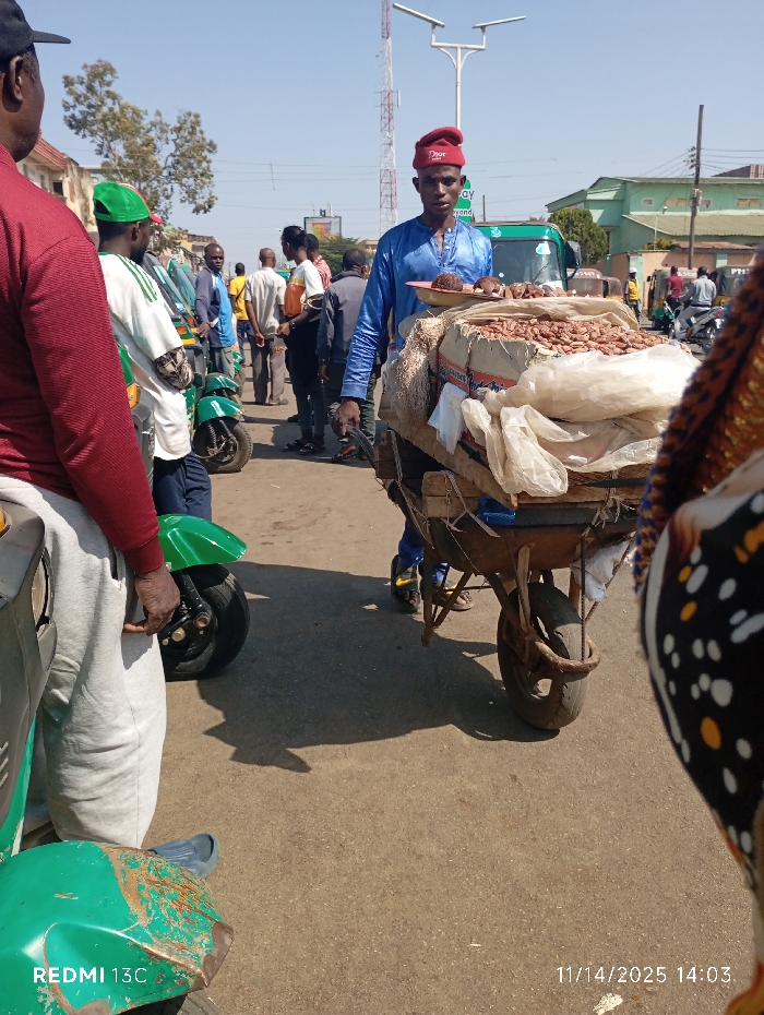 A man wearing a red hat and a blue shirt pushes a wheelbarrow full of goods on a sunny day. He holds a scale in one hand, seemingly selling the items. Around him, there are parked green vehicles and several people, creating a bustling street scene. A tall communications tower stands in the background under a clear blue sky.