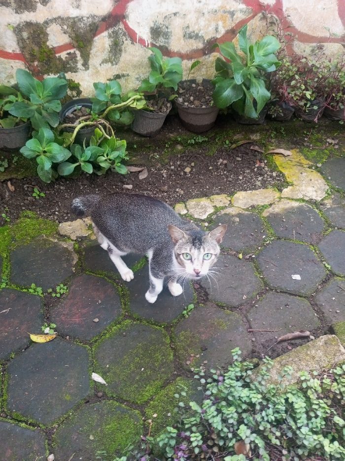 A grey and white cat with green eyes stands on a stone patio, gazing upward. The patio stones are covered in patches of green moss. Behind the cat, a row of potted plants sits against a weathered wall. The plants vary in size and type, with some exhibiting large, green leaves. The wall shows signs of aging, with moss growth and faded red paint.