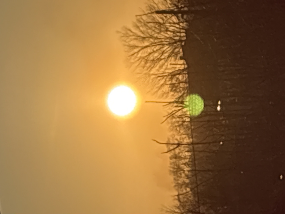The scene is set in Stefan Karadja, Bulgaria, during either sunrise or sunset, evidenced by the pervasive orange-yellow hue of the sky. A bright, circular, white-yellow sun is prominently positioned in the upper-center of the frame. Below the sun, a line of silhouetted, bare deciduous trees extends horizontally across the mid-ground, displaying intricate branch structures against the illuminated sky. The dark outline of a building's roof is discernible behind the trees, primarily towards the right side of the image. A distinct, circular, green lens flare is visible in the lower-center foreground, superimposed over the tree line. Additionally, several small, scattered white light points are present near the bottom of the frame. No individuals, animals, or explicit actions are observed within the depicted environment.