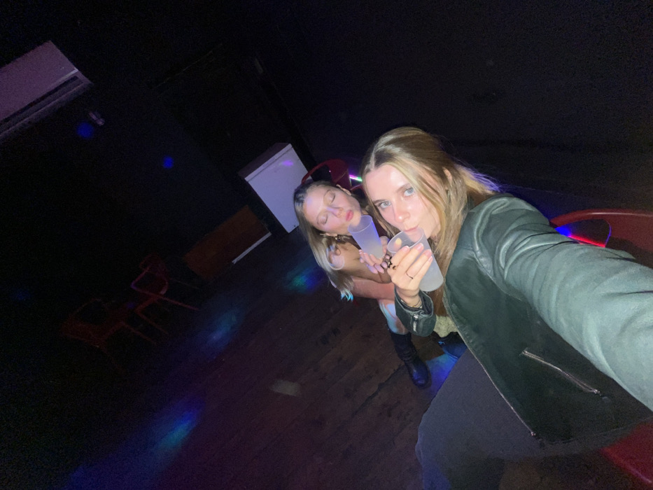 This image depicts two females inside a dimly lit establishment, likely a bar or nightclub, characterized by a dark environment, wooden floor, and colored ambient lighting (blue, purple, red)