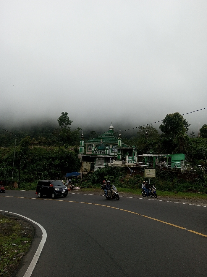 This image depicts a mountainous, foggy landscape in the city of Sandamal Eliya, Sri Lanka, centered around a two-lane asphalt road. The road, marked with a solid white edge line on the left and a double yellow center line, curves from the lower left to the right. On the right side of the road, a green and white mosque is prominently situated on an elevated concrete platform against a densely vegetated hillside. The mosque features a large central green dome, smaller domes on its two minarets, and the text "MASJID JAMI AL IKHLAS" displayed in white letters above its main entrance. Behind the mosque, the mountain slopes are covered with lush green foliage, gradually disappearing into thick, grey fog that fills the upper portions of the scene and obscures the sky. On the road, a black minivan travels away from the viewer in the left lane. In the right lane, two motorcycles are observed, each carrying two riders who are wearing helmets. To the right of the main mosque structure, a smaller green building with a metal fence is visible. A utility pole is present on the left side of the road, and power lines extend across the upper right section of the image. The scene is illuminated by overcast daylight.