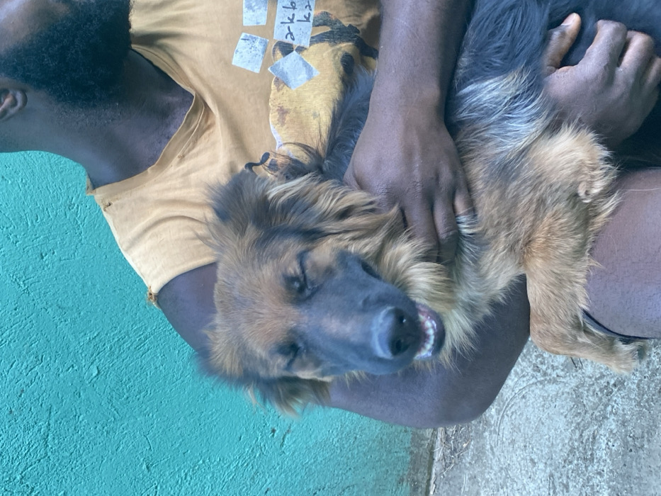 A man cradles a brown and black German Shepherd-like dog in his arms. The dog appears relaxed, its eyes closed, and mouth slightly open, possibly smiling. The man wears a yellow t-shirt with square shapes on it and has dark skin and a beard. The background includes a turquoise wall and light-colored concrete. The image is shot from a high angle.