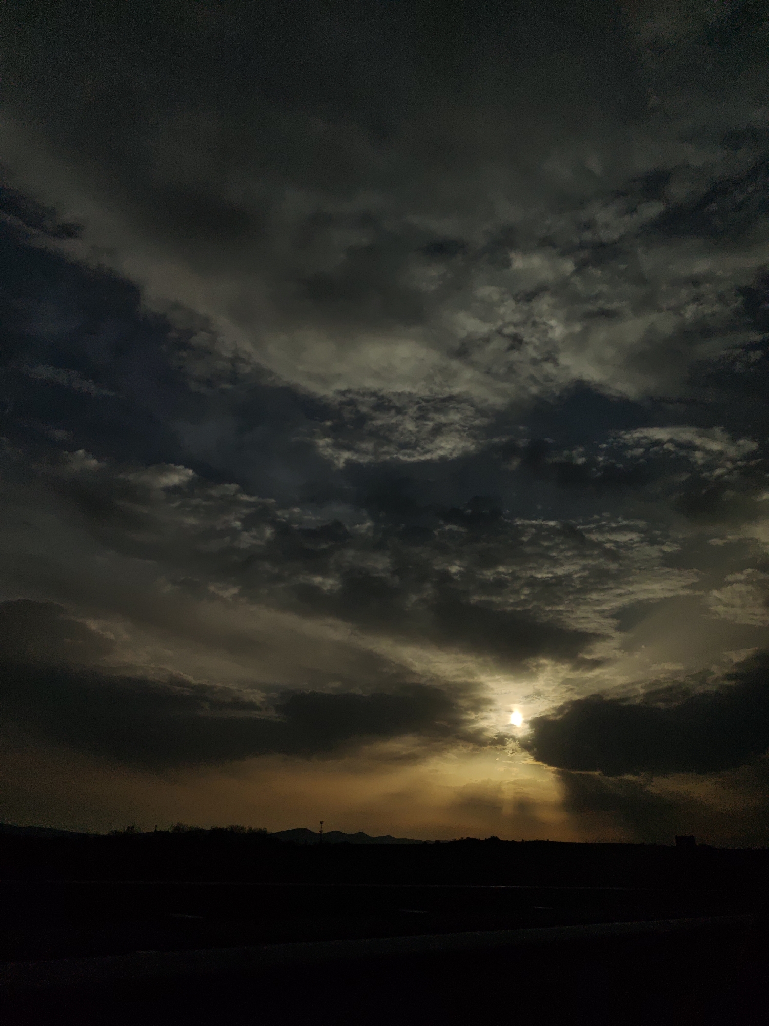 sunset or sunrise over a flat landscape. The sky is filled with dark, dramatic clouds, with the sun partially obscured, emitting rays of light. Below the horizon line, a dark, silhouetted landmass suggests a field or low hills. The bottom portion of the image is mostly black, indicating the vantage point may be from a low angle or a vehicle. There's no immediate indication of a specific location within Chernodab, Bulgaria. The scene lacks any people or clear objects, focusing primarily on the sky and the obscured sun. No interaction is present in this image.
