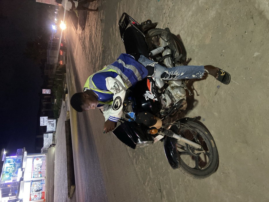 A person lies prone atop a motorcycle, positioned at an angle. The individual wears a blue and white jacket, ripped jeans, and sandals. The motorcycle is black with a silver engine. The setting appears to be a street at night, illuminated by streetlights, with buildings visible in the background. The road surface is asphalt, and the motorcycle is parked on the shoulder.