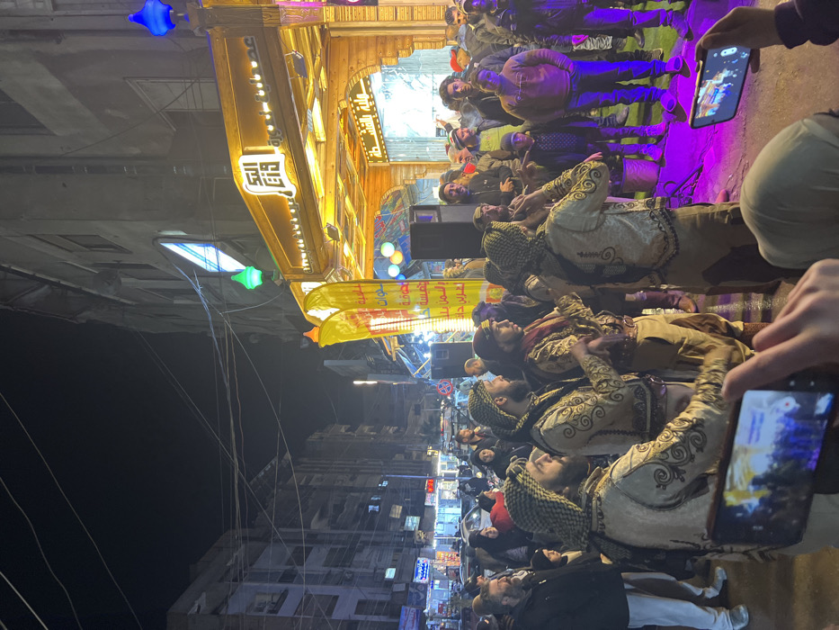 A street scene at night shows a procession of men in ornate, Middle Eastern-style clothing and head coverings. They appear to be performing or chanting, as they are all looking upwards. Onlookers stand to the side, some holding up phones to record the event. Buildings are visible in the background, with storefronts illuminated by bright lights. The atmosphere suggests a religious or cultural celebration.